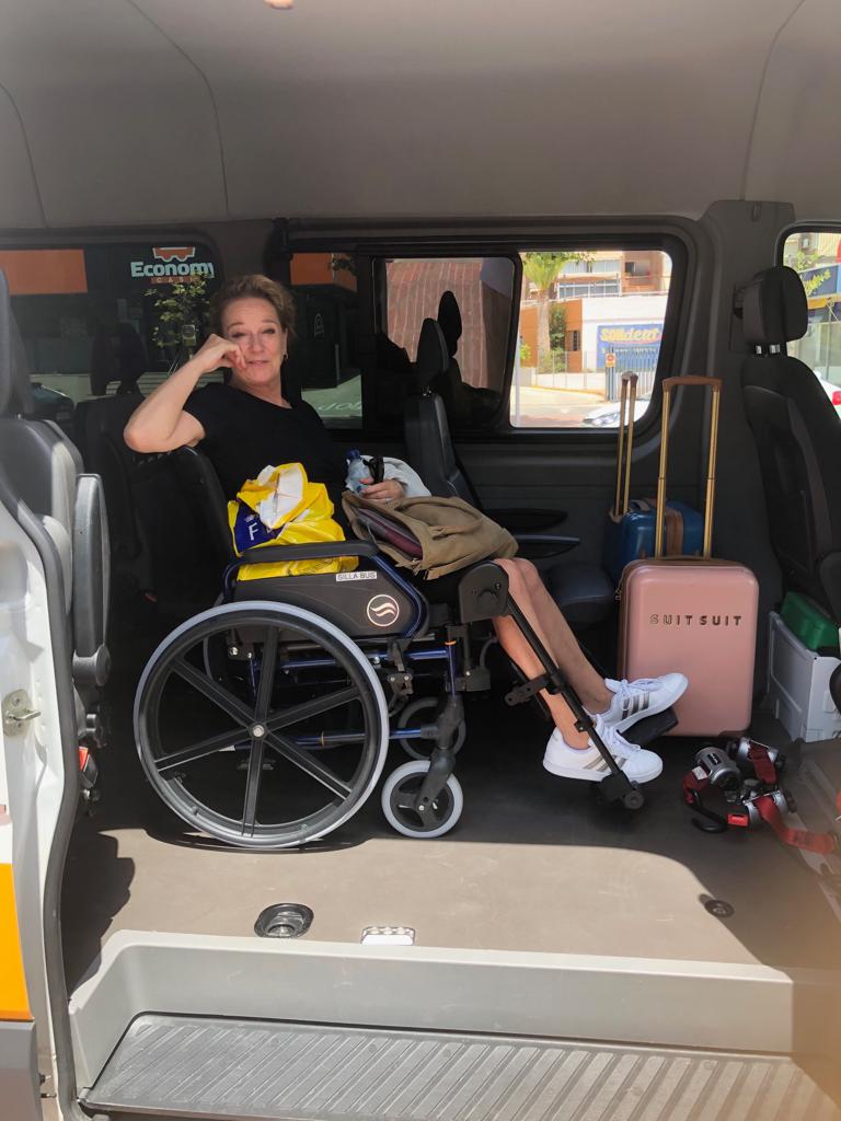 Daar ging ik weer, inwendig brullend van de lach. Ik in die rolstoel! Dag ziekenhuis, dag verpleegsters… Toen naar buiten waar een busje klaar stond. ‘I can walk!’, zei ik. Maar: ‘No, no!’, zei Juan. De achterdeuren gingen open en daar, als een soort verschijning, zakte een liftje naar beneden. Ik werd er met rolstoel en al op geduwd. Oké, deze absurditeit kon er ook nog wel bij. Met zo’n 30 kilometer per uur, voorzichtig verkeersheuvels omzeilend, reden we door het Spaanse landschap. Ik kneep nog een paar keer in mijn arm en besloot te genieten van mijn rol als patiënt. Me terdege realiserend dat dit voor mij tijdelijk is, en dat ik verder gezegend ben met een geweldige gezondheid. Gracias a dios!