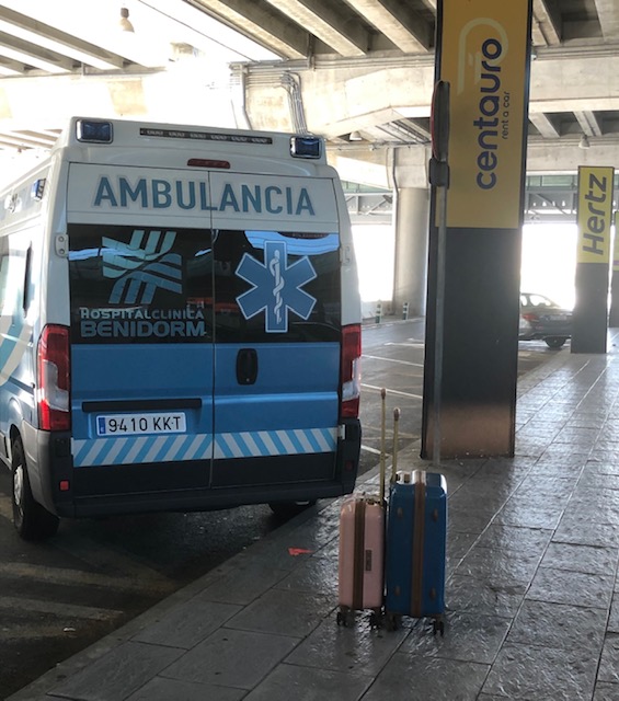 ‘Ambulance? Ik kan nog heel goed lopen hoor.’ ‘Ja, maar dat is nu eenmaal het protocol.’ Gelukkig mocht ik wel voorin zitten, en heb nog íets van de skyline van Benidorm gezien.